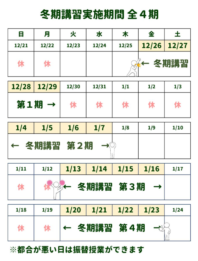 個別指導の冬期講習 冬期講習の通い方 ① 参加期間(第1期~第4期) ② 授業時間帯(A~D) ③ 学習教科 冬期講習の授業料 ☆15,000円分の入塾特典☆ ご見学・体験学習のおすすめ 無料体験学習のご予約 冬期講習のお申込み 必須お子様のお名前 必須フリガナ 必須学校名 必須学年 中3中2中1小6小5小4高3高2高1 必須メールアドレス 必須参加期間(1つ選ぶと1セット、2つで2セット・・・) 1期:12/26(金)~12/29(月)2期:1/4(日)~1/7(水)3期:1/13(火)~1/16(金)4期:1/20(火)~1/23(金) 必須授業時間帯 A:14:45~16:15 ※2期のみB:16:30~18:00 ※2期のみC:18:15~19:45D:20:00~21:30 必須学習教科(1セットで2教科学べます) 数学英語国語理科社会 任意君の目標を聞かせてください(ここになければ選ばなくて大丈夫です。授業で詳しく教えてください) ニガテに集中したいわからない単元まで戻ってほしいいままでの総復習がしたい新しい学年の予習をしたい応用問題にチャレンジしたい 任意その他、授業へのご要望、ご都合の悪い日の振替授業のご希望など、連絡事項がございましたらご記入ください Δ その他、冬期講習について 共有: クリックして X で共有 (新しいウィンドウで開きます) X Facebook で共有するにはクリックしてください (新しいウィンドウで開きます) Facebook